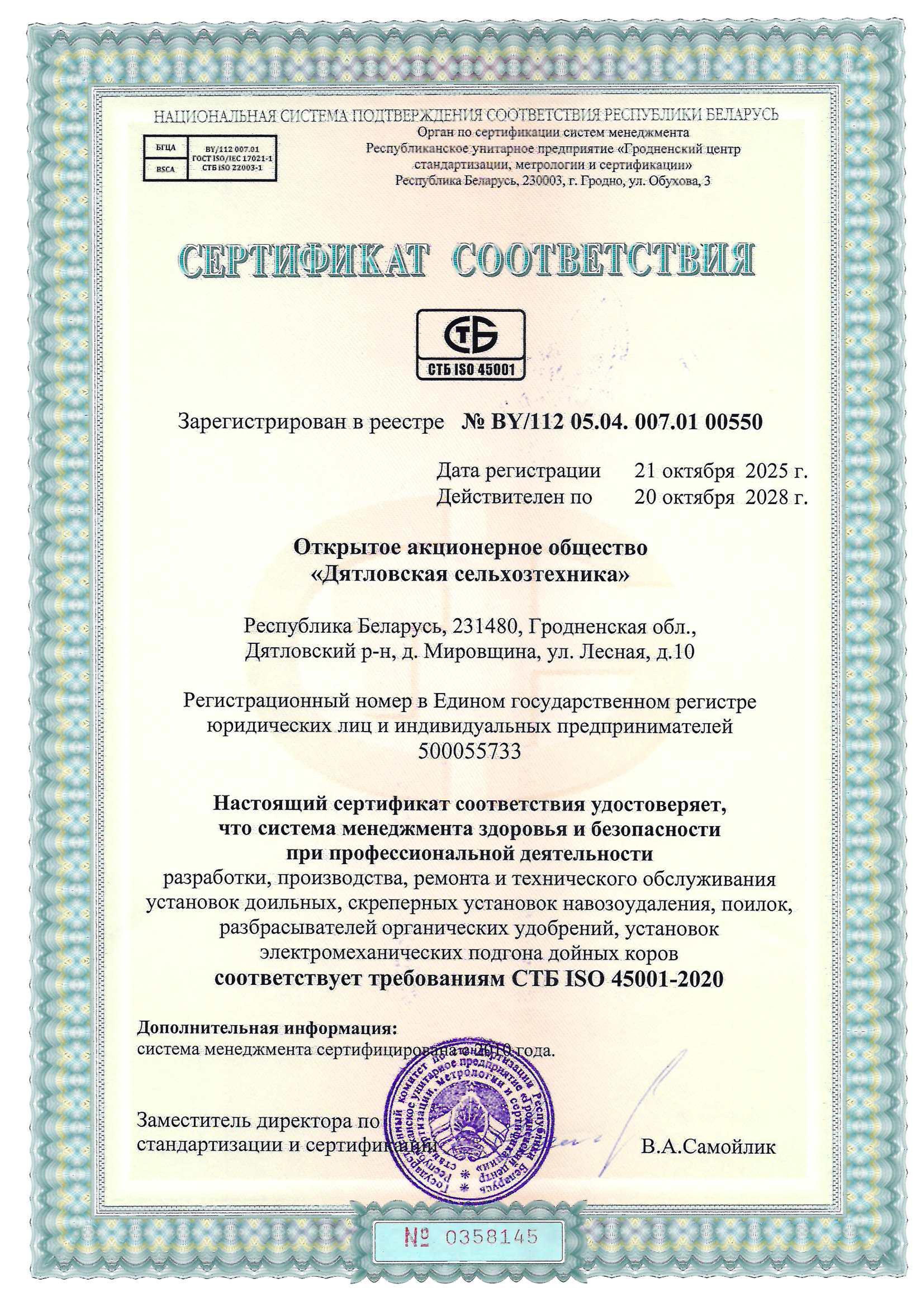 Сертификаты соответствующие требованиям СТБ ISO 9001-2015, СТБ ISO 45001-2020