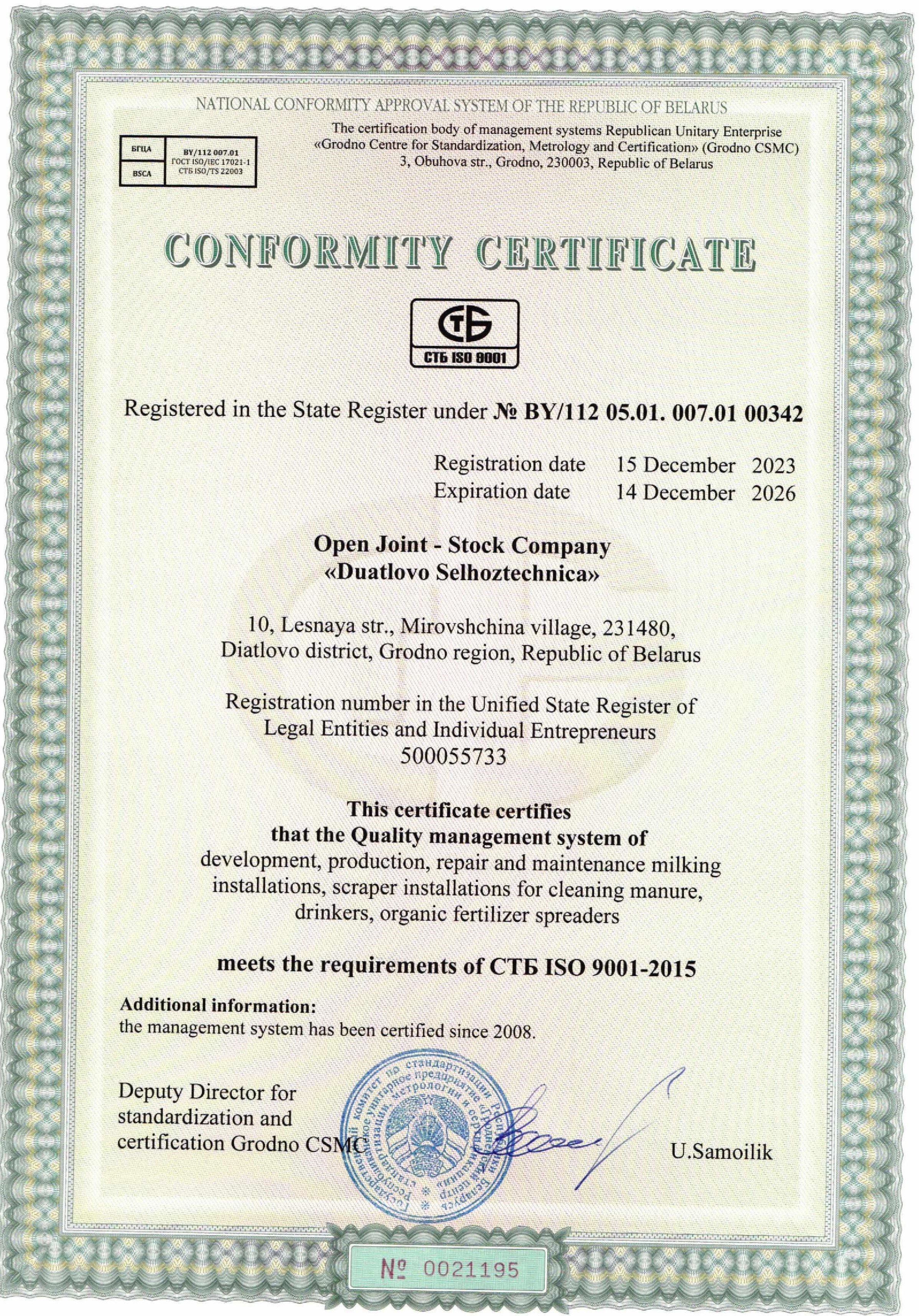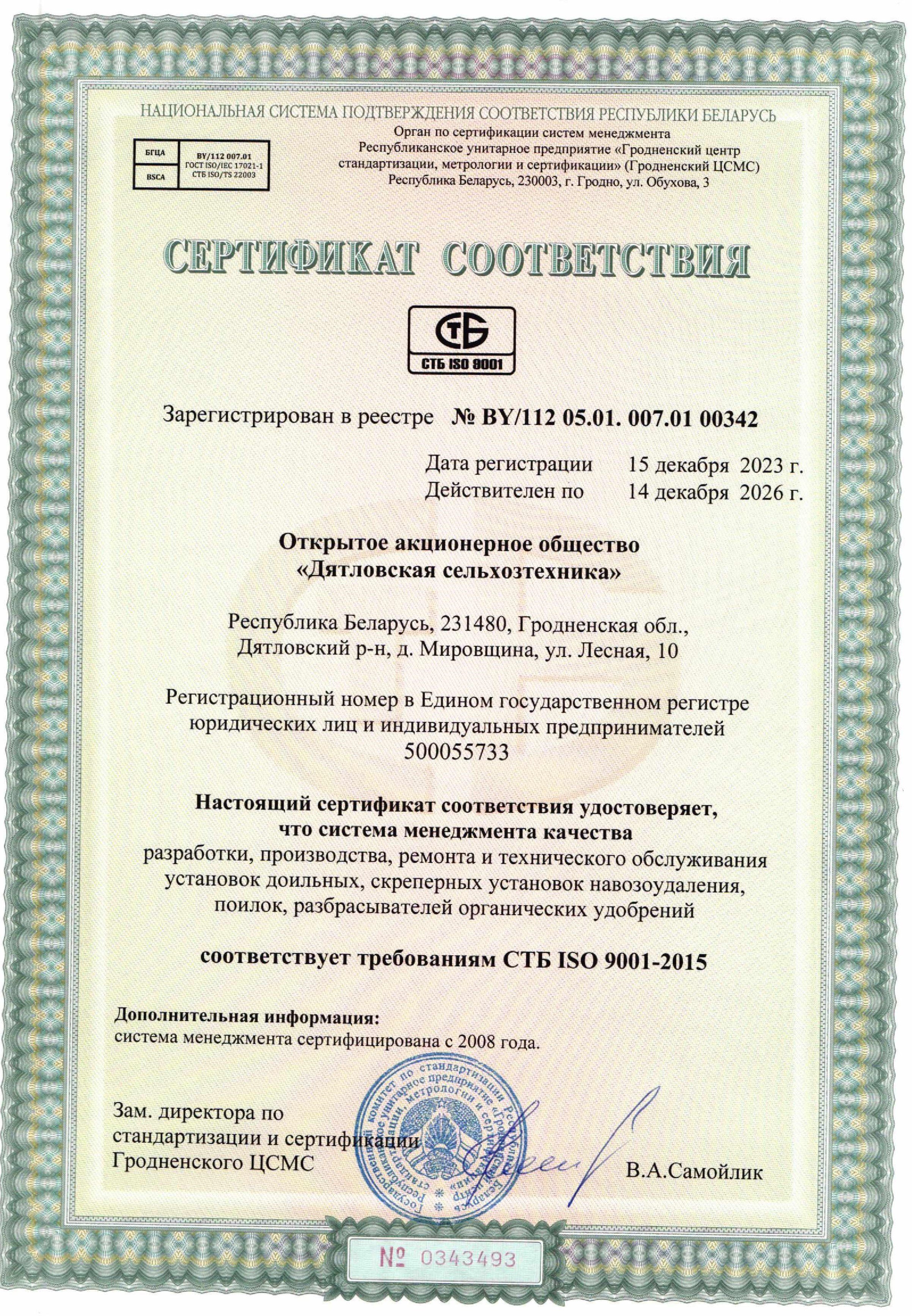 2020 год. Предприятие прошло повторную сертификацию СМК на соответствие требованиям СТБ ИСО 9001-2015. Система менеджмента качества «Разработка, производство, ремонт и техническое обслуживание опрыскивателей полуприцепных штанговых, установок доильных, скреперных установок навозоудаления, поилок, разбрасывателей органических удобрений» была сертифицирована в Национальной системе подтверждения соответствия (Аккредитованный орган по сертификации систем менеджмента РУП "Гродненский ЦСМС") на соответствие требованиям СТБ ИСО 9001-2015. Получен сертификат соответствия № BY/112 05.01. 007 1516 от 16.12.2020 г. (действителен до 16.12.2023 г.).