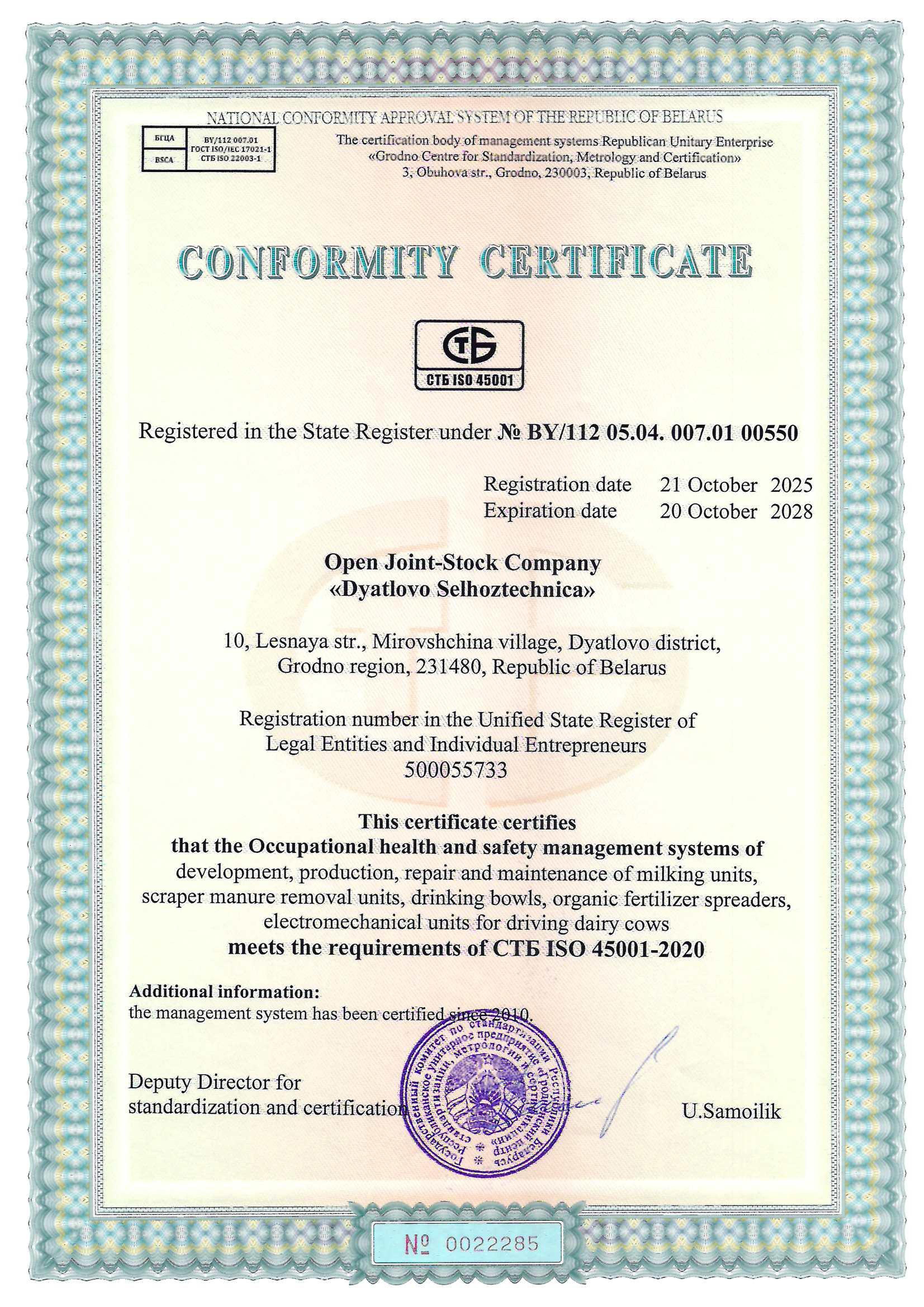 Сертификаты соответствующие требованиям СТБ ISO 9001-2015, СТБ ISO 45001-2020